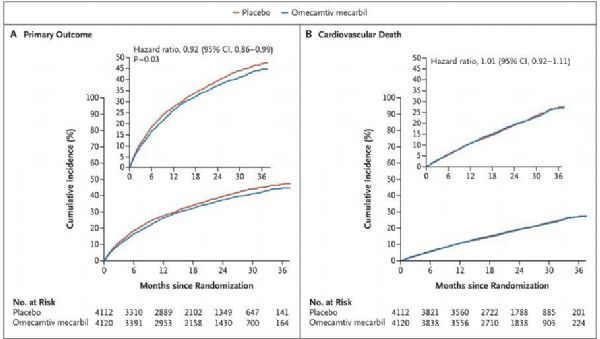 结果显示,omecamtiv mecarbil达到了主要复合疗效终点:中位随访21.8个月后,在接受标准护理的患者中,与安慰剂相比,omecamtiv mecarbil将心血管(CV)死亡或心衰事件(心衰住院或其他心衰紧急治疗)的主要复合终点的风险在统计学上显著降低(HR=0.92;95%CI:0.86,0.99;p=0.025)。omecamtiv mecarbil治疗组有37.0%(n=1523/4112)的患者发生了首次主要终点事件,安慰剂组为39.1%(n=1607/4112)。观察到这种效应时,没有证据表明心肌缺血事件、室性心律失常、心血管或全因死亡增加。