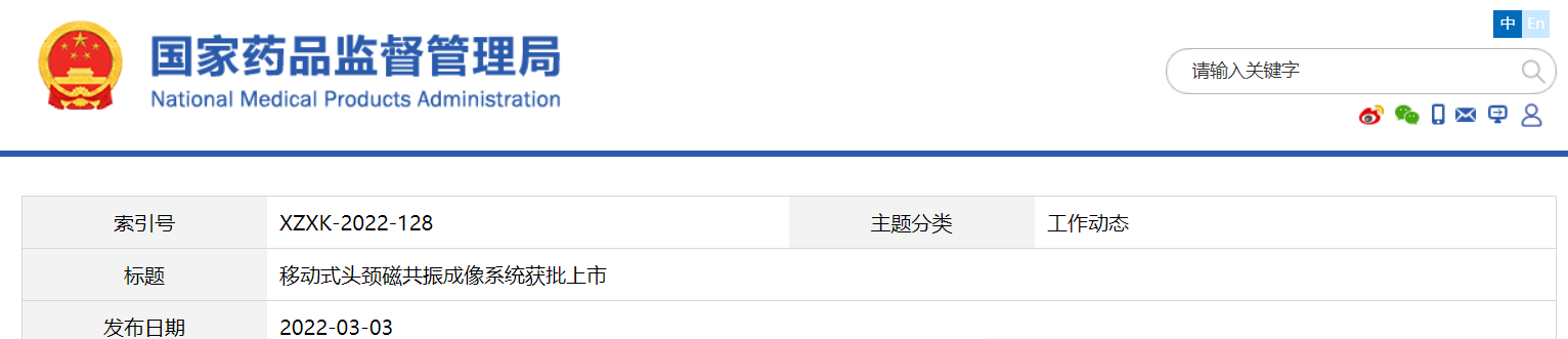 3月3日,NMPA官网显示,佛山瑞加图医疗科技有限公司生产的“移动式头颈磁共振成像系统”的创新产品注册申请已被批准。