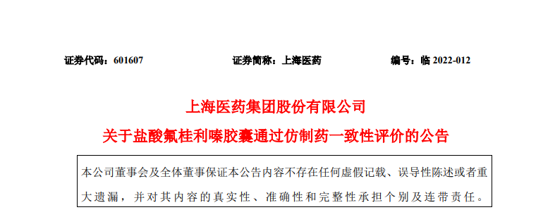 3月3日,上海医药发布企业公告称,近日,上海医药控股子公司山东信谊收到国家药品监督管理局颁发的关于盐酸氟桂利嗪胶囊的《药品补充申请批准通知书》,该药品通过仿制药一致性评价。