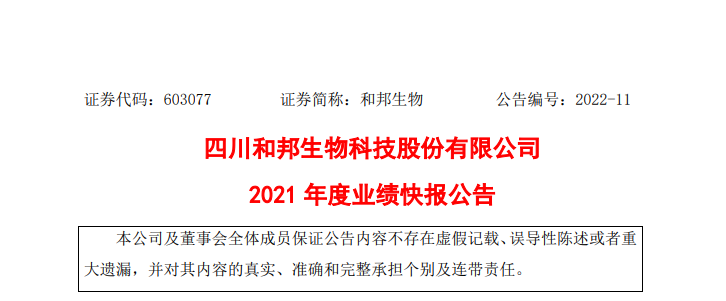 3月3日,和邦生物发布2021年业绩快报,公告称,公司2021年度实现营业收入98.67亿元,较上年同期增加87.56%;公司2021年度实现归属于上市公司股东的净利润30.23亿元,较上年同期增加7284.28%。实现归属于上市公司股东的扣除非经常性损益的净利润30.14亿元,较上年同期增加690.68%。