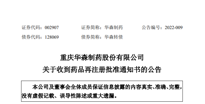 3月3日,华森制药发布公告称,公司于近日收到重庆市药品监督管理局核准签发的关于公司产品注射用二乙酰氨乙酸乙二胺(0.2g 及 0.4g)的《药品再注册批准通知书》。