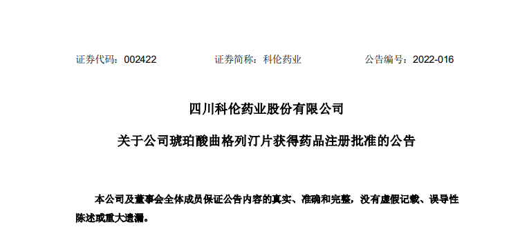 3月11日,科伦药业发布公告称,公司的化学药品“琥珀酸曲格列汀片”于近日获得NMPA的药品注册批准。