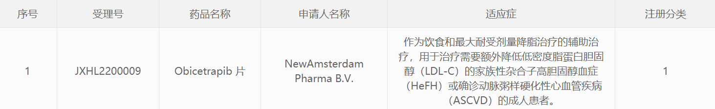 3月23日,中国国家药监局药品审评中心(CDE)官网公示,由NewAmsterdam Pharma公司申报的obicetrapib片获得临床试验默示许可,拟作为饮食和最大耐受剂量降脂治疗的辅助治疗,用于治疗需要额外降低低密度脂蛋白胆固醇(LDL-C)的家族性杂合子高胆固醇血症(HeFH)或确诊动脉粥样硬化性心血管疾病(ASCVD)的成人患者。