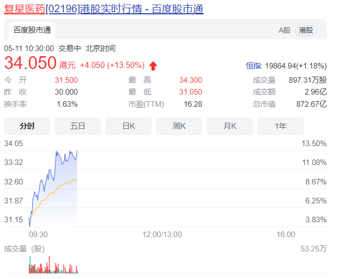 今日股市开盘,复星医药一路高涨,A股已触及涨停板,港股大涨超10%(截止发稿)。消息面上,BioNTech在中国完成了复必泰疫苗的II期试验。