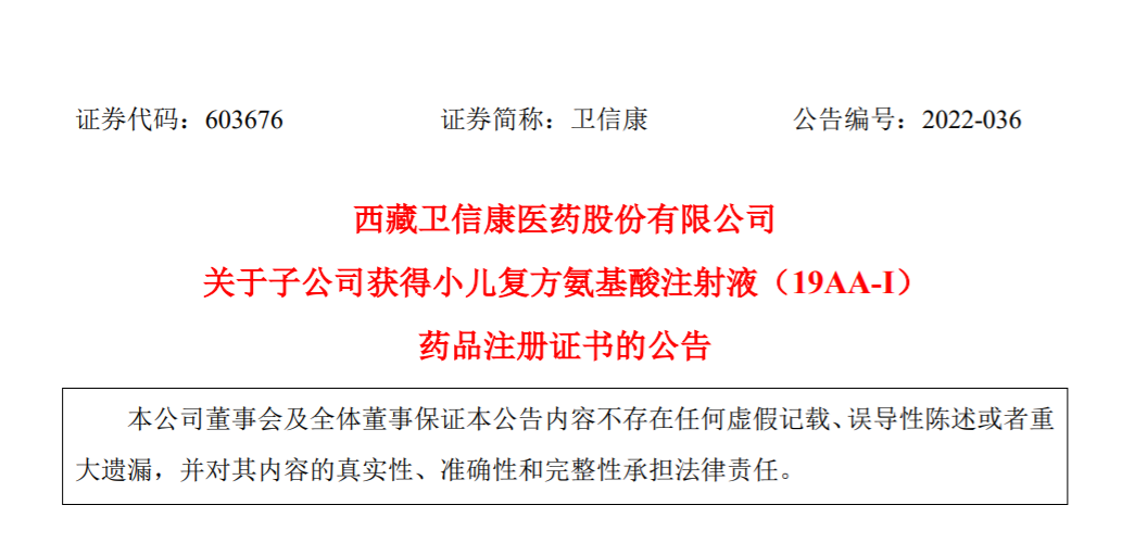 5月16日,卫信康发布公告称,全资子公司内蒙古白医制药收到国家药监局核准签发的小儿复方氨基酸注射液(19AA-I)《药品注册证书》。