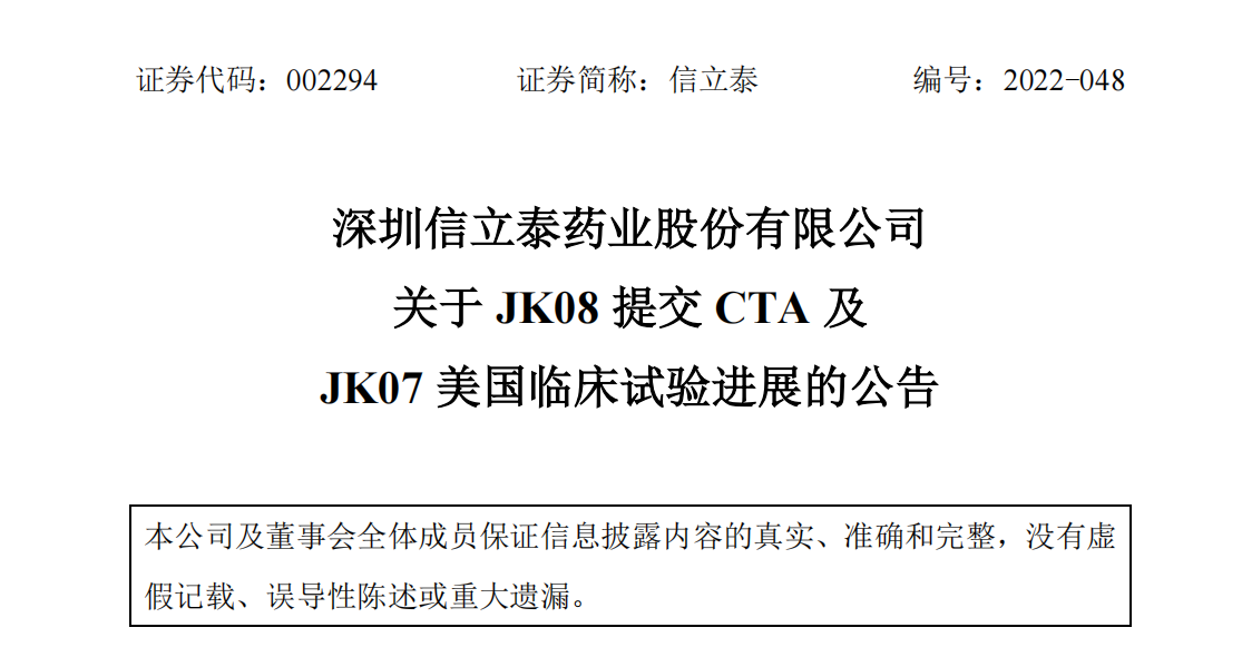 5月23日,信立泰发布公告称,收到下属子公司美国Salubris Biotherapeutics, Inc.的通知,其自主研发的创新抗肿瘤生物制品JK08已在欧洲提交了首个 CTA(临床试验申请);同时,JK07的HFrEF(射血分数减少的心衰)适应症在美国开展的 I 期临床第二组试验入组完成,并取得早期的初步试验数据。