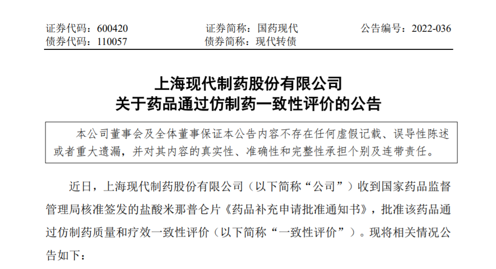 5月23日,国药现代发布公告称,盐酸米那普仑片药品收到国家药监局核准签发的《药品补充申请批准通知书》,批准该药品通过仿制药一致性评价。