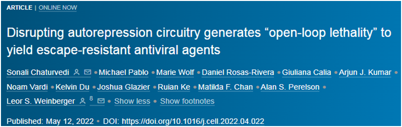 如今,在一项新的研究中,格拉斯通研究所的Leor Weinberger博士和Sonali Chaturvedi博士及其研究团队开发出一类新的称为反馈干扰剂(feedback disruptors)的药物,它们有可能成为阻止抗药性产生的药物(resistance-proof drug,即防抗药性药物)。相关研究结果于2022年5月12日在线发表在Cell期刊上,论文标题为“Disrupting autorepression circuitry generates 'open-loop lethality' to yield escape-resistant antiviral agents”。