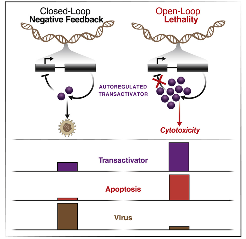 这种新的反馈干扰方法源于Weinberger实验室早先在巨细胞病毒(CMV)中发现的一种关键反馈回路,其中CMV是一种常见的疱疹病毒类型。在受感染的宿主细胞内,这种反馈回路调节着IE86的产生,这是这种病毒增殖所需的一种蛋白。一旦IE86达到足够高的水平,它就会关闭自己的产生,直到它的浓度下降并稳定下来。这是因为过多的IE86对宿主细胞是有毒的。