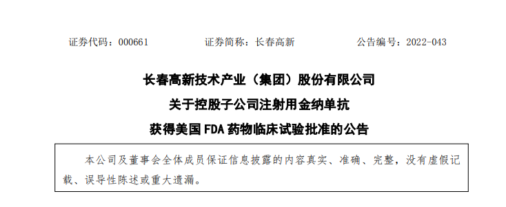 6月14日,长春高新公告,控股子公司金赛药业收到美国FDA关于注射用金纳单抗用于成人斯蒂尔病(AOSD)的临床许可的函。