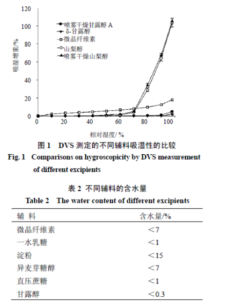 图1显示了通过动态水分吸附分析(DVS)测定的不同辅料吸湿情况的比较。在所有相对湿度下,甘露醇都表现出最低的吸水增重。表2则显示了不同辅料的含水量水平。