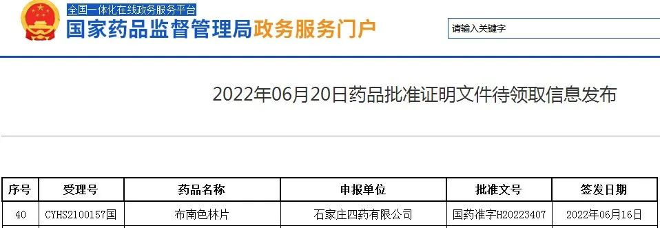 6月20日,国家药监局官网显示,石家庄四药以仿制4类报产的布南色林片获批生产,为国内首仿。米内网数据显示,日本住友的布南色林片在2021年中国公立医疗机构终端及中国城市实体药店终端合计销售规模超过3000万元,同比增长51.46%。