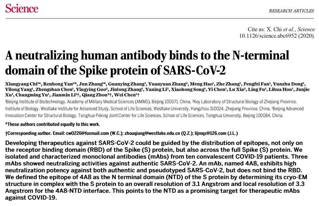 记者24日从军事科学院获悉,由中国工程院院士、该院军事医学研究院研究员陈薇领衔的科研团队,发现了首个靶向刺突蛋白N端结构域的高效中和单克隆抗体。北京时间6月22日22点,国际顶级学术期刊《科学》在线发表了该项研究成果。该成果可为新冠肺炎的治疗提供强效候选药物,也为靶向刺突蛋白N端结构域的药物和表位疫苗设计、新冠病毒作用机制研究,提供了崭新思路。