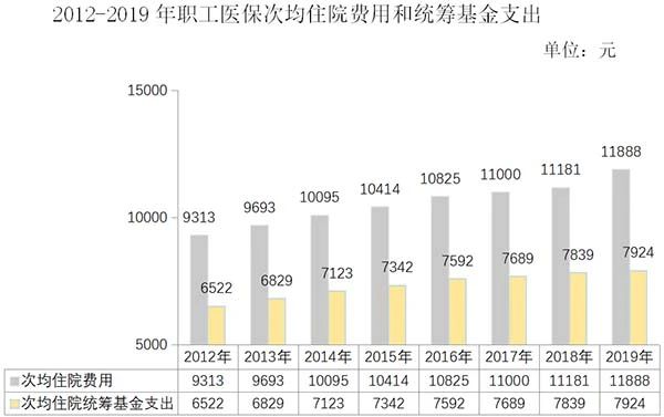 4、次均住院费用持续增长。2019年,全国职工医保次均住院费用为11888元,比上年增长6.3%。