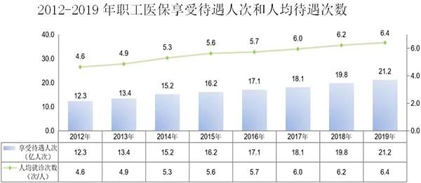 3、享受待遇人次增加。2019年参加职工医保人员享受待遇21.2亿人次,比上年增长7.3%,增幅下降1.7个百分点。其中:普通门急诊18.1亿人次,比上年增长5.8%;门诊慢特病2.6亿人次,比上年增长19.4%;住院0.6亿人次,比上年增长6.8%。