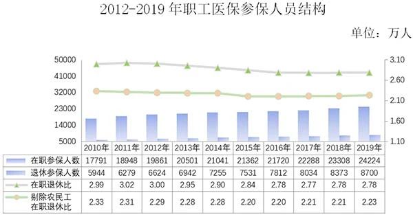 1、参保人数持续增加。参加职工医保32925万人,比上年增加1244万人,增长3.9%。其中在职职工24224万人,比上年增长3.9%;退休职工8700万人,比上年增长3.9%。在职退休比为2.78,同比持平。