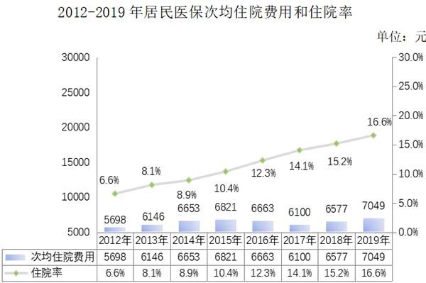 4、住院率和次均住院费用均上涨。居民医保参保人员住院率为16.6%,比上年提高1.4个百分点;次均住院天数9.2天,比上年降低0.1天;次均住院费用7049元,比上年增长7.2%。其中在三级、二级、一级及以下医疗机构的次均住院费用分别为12350元、6076元、3281元,分别比上年增长8.6%、3.4%、4.3%。