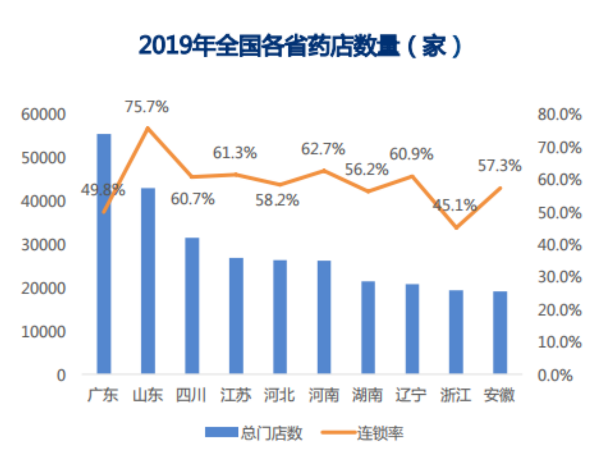 药店数量方面,中康CMH数据显示,截至2019年,广东省药店总数量约为5.5万家,药店数量排名全国第一。其中,连锁药店门店数量为2.77万,单体店为2.78万,连锁率达到49.8%,连锁率略低于全国。