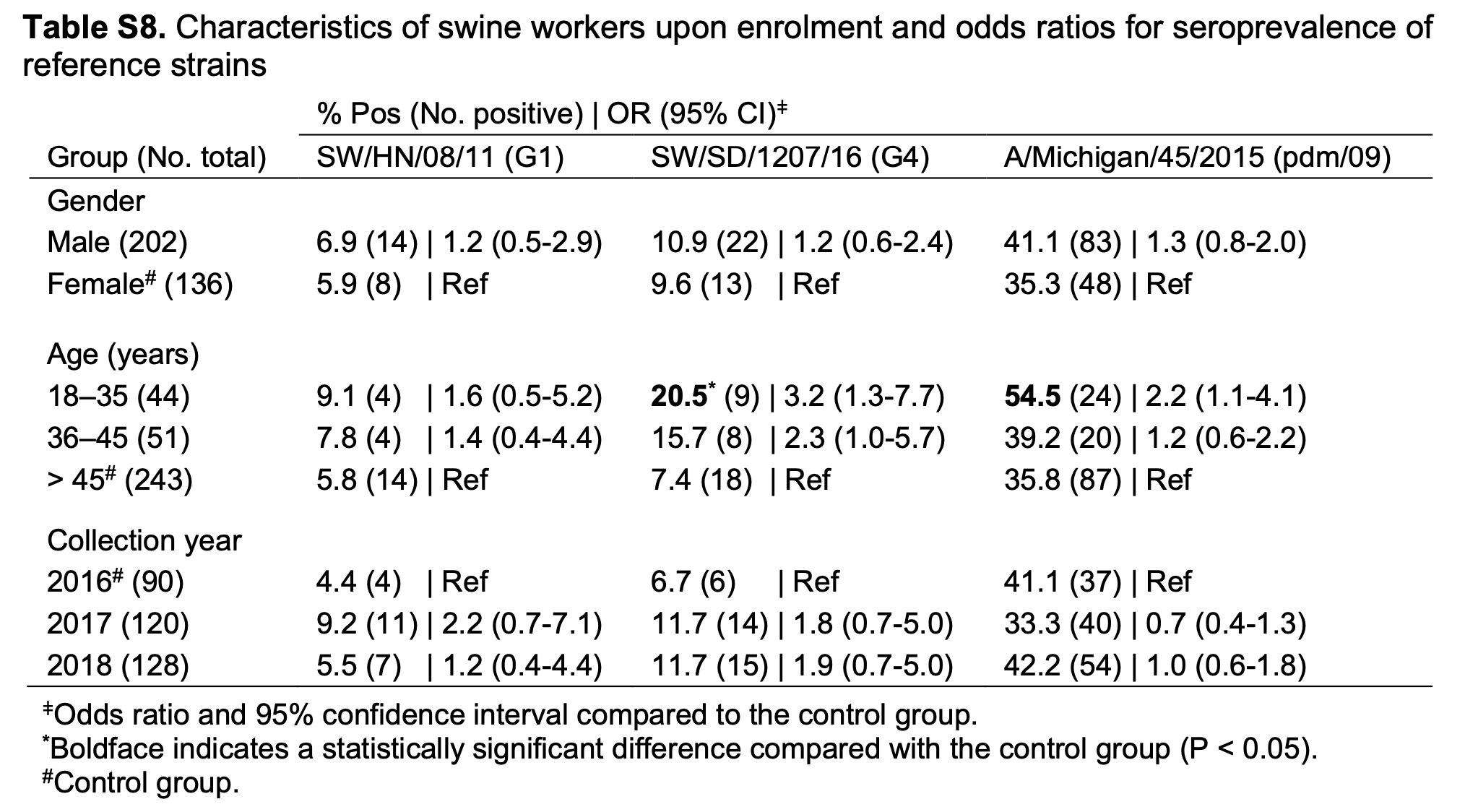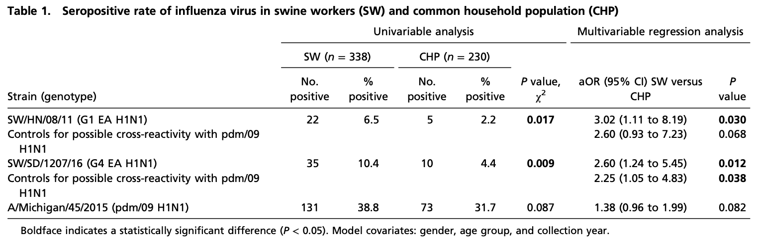 在338分养殖人员的血样中,有35份对G4 EA H1N1呈阳性,占比10.4%;对照组也有10份呈阳性,占比4.4%。在控制pdm/09 H1N1的交叉反应之后,两组之间的差异依然显著。