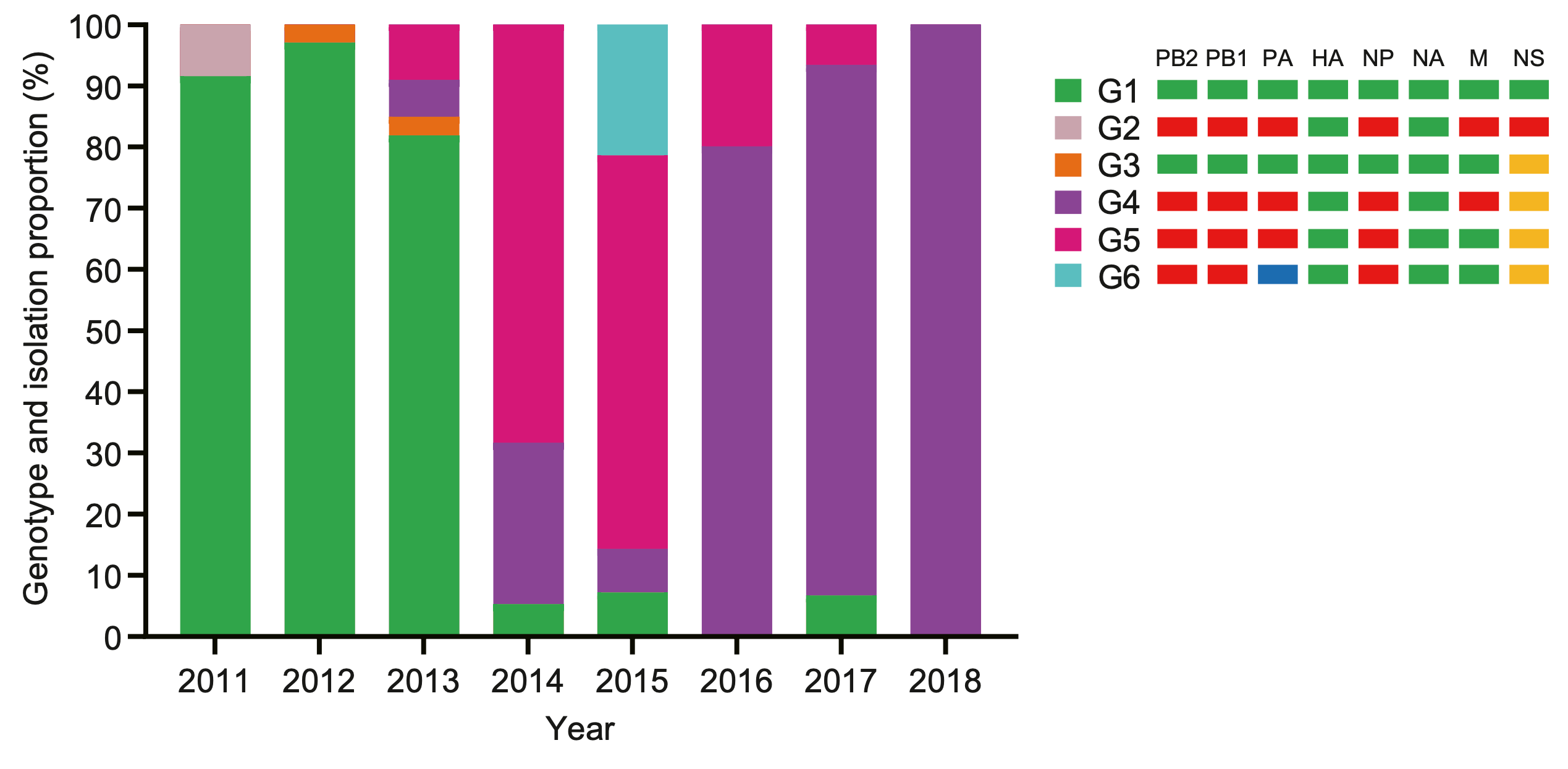 从上图不难看出,2014年之后纯正的G1 EA H1N1几乎消失了。而G4 EA H1N1从2016年开始急剧飙升,成为主流。具体来看,G4 EA H1N1病毒拥有EA H1N1病毒的HA和NA基因,pdm/09 H1N1病毒的M基因和病毒核糖核蛋白(vRNP)基因,以及TR H1N1病毒的非结构(NS)基因。