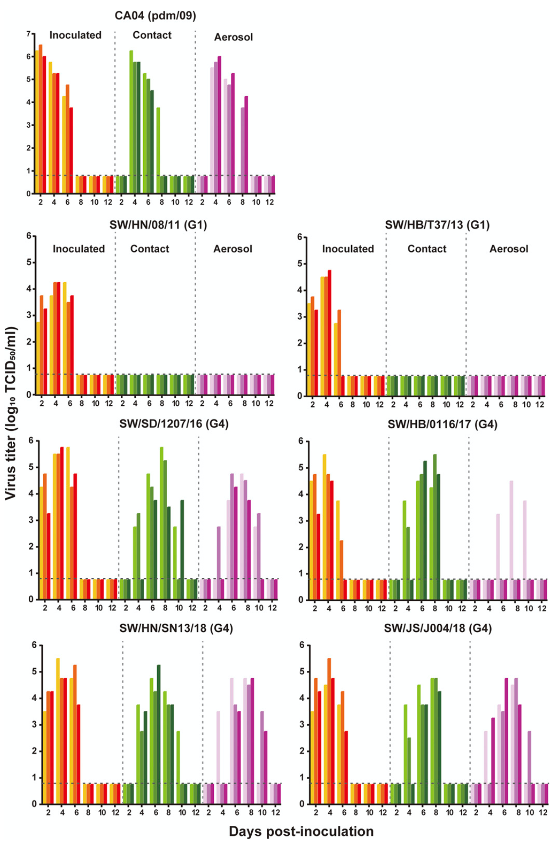 研究结果显示,G4 EA H1N1与pdm/09 H1N1一样,都可以通过直接接触传播和呼吸道飞沫传播。而G1 EA H1N1不能通过两种方式传播。