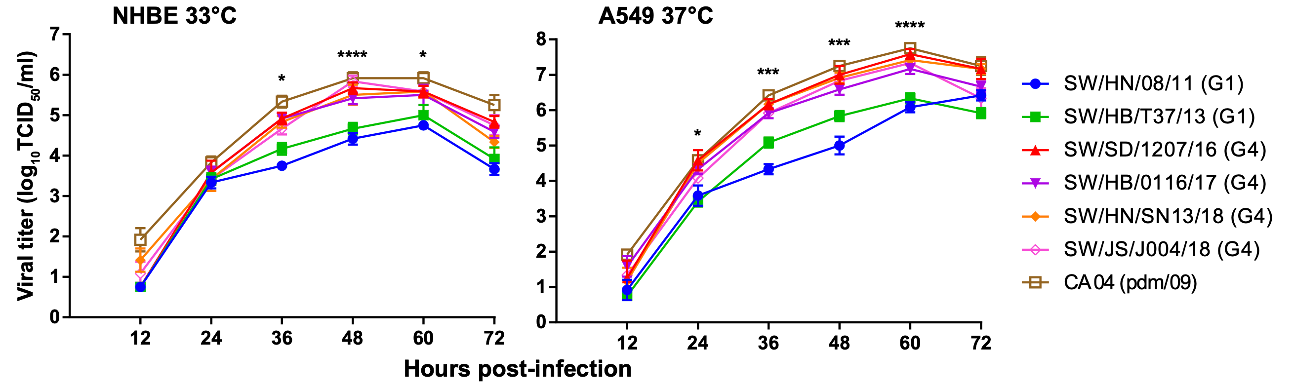 总的来说,G4 EA H1N1的复制能力与pdm/09 H1N1相似,强于纯正的猪流感病毒G1 EA H1N1。这说明,G4 EA H1N1可以在人气道上皮细胞中高效复制。