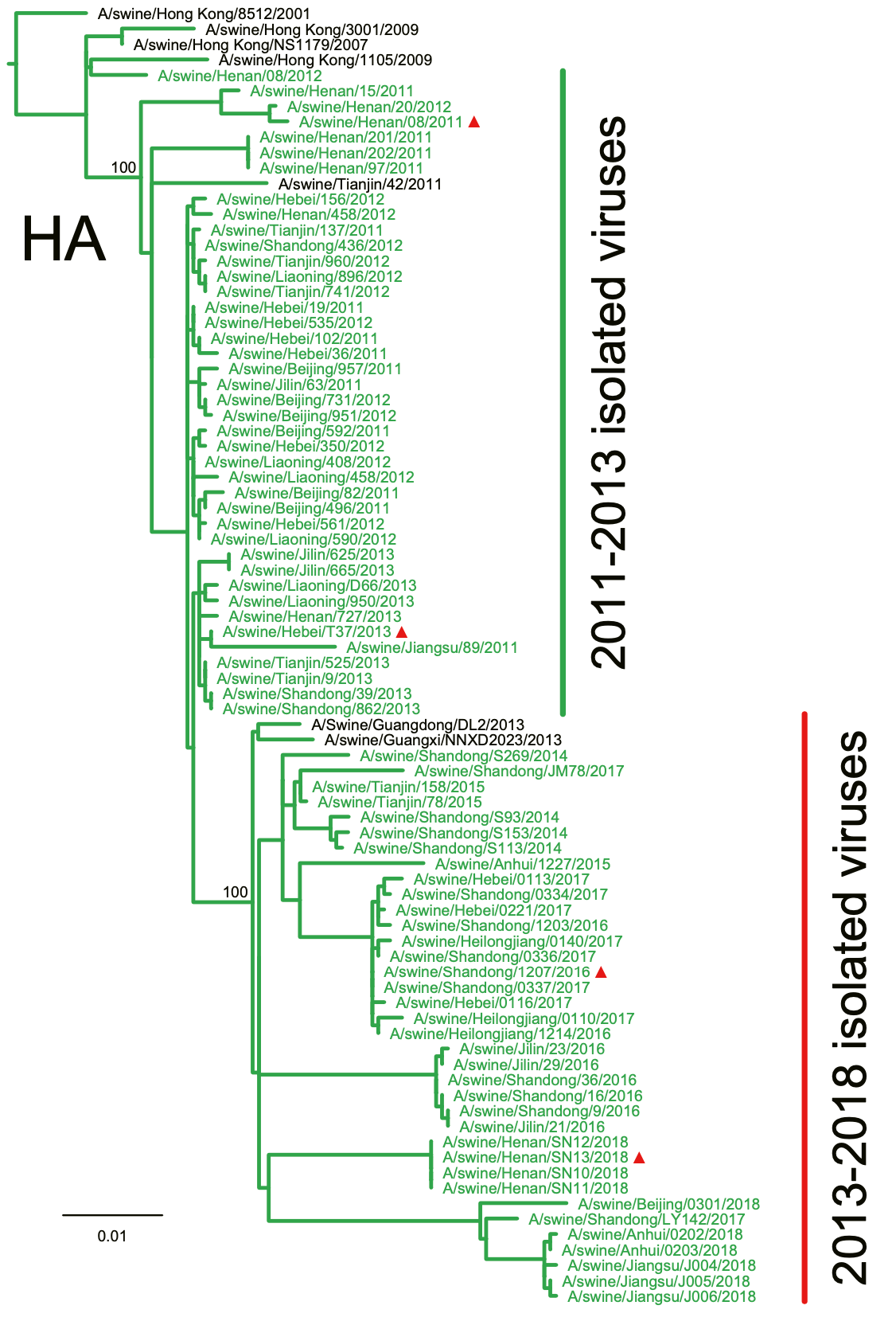 研究人员累计分离到179个猪流感病毒。分析编码病毒表面刺突蛋白血凝素(HA蛋白)和神经氨酸酶(NA蛋白)的基因之后,研究人员发现165个是EA H1N1,另外有7个是pdm/09 H1N1。这说明EA H1N1是中国主要的亚型,而pdm/09 H1N1虽然起源于猪,但是现在已经不适应在猪体内繁殖了。此外,而且EA H1N1在病猪中的分离占比从2011年的1.4% ,上升到8.21%。