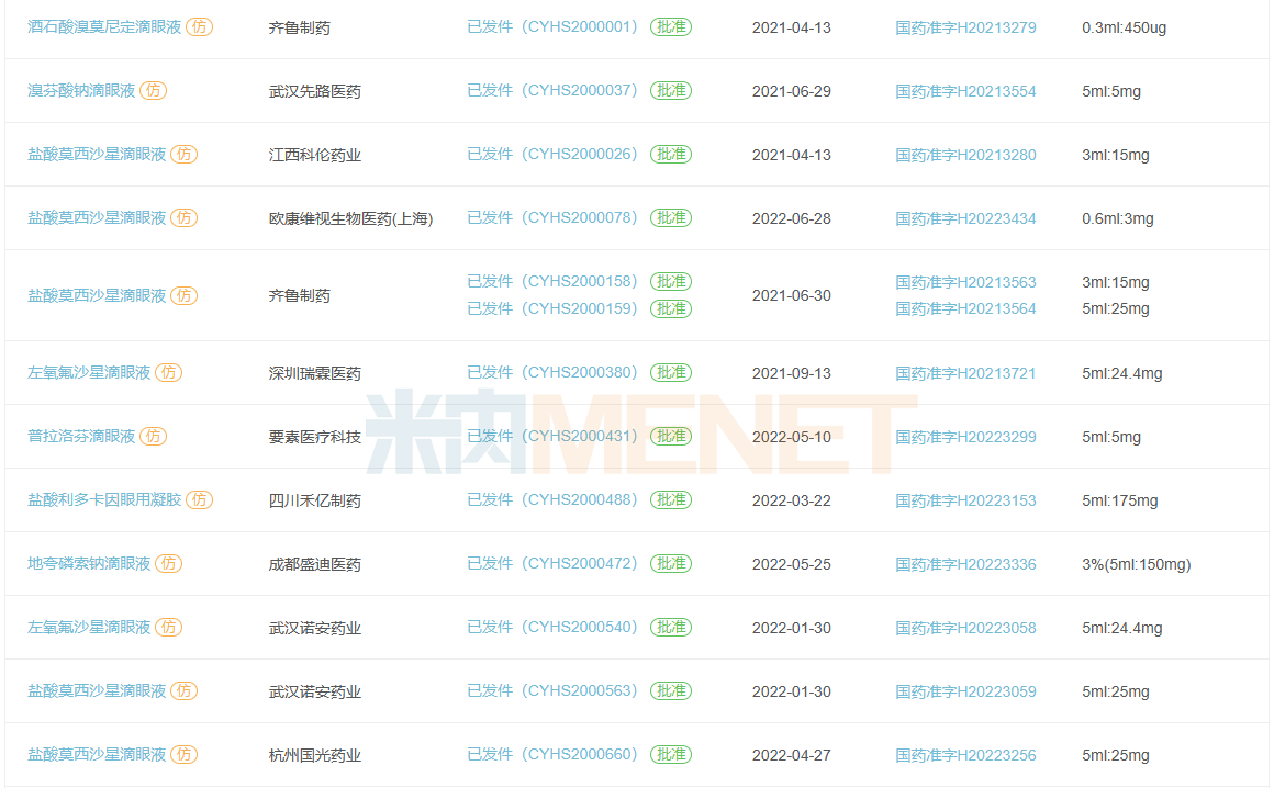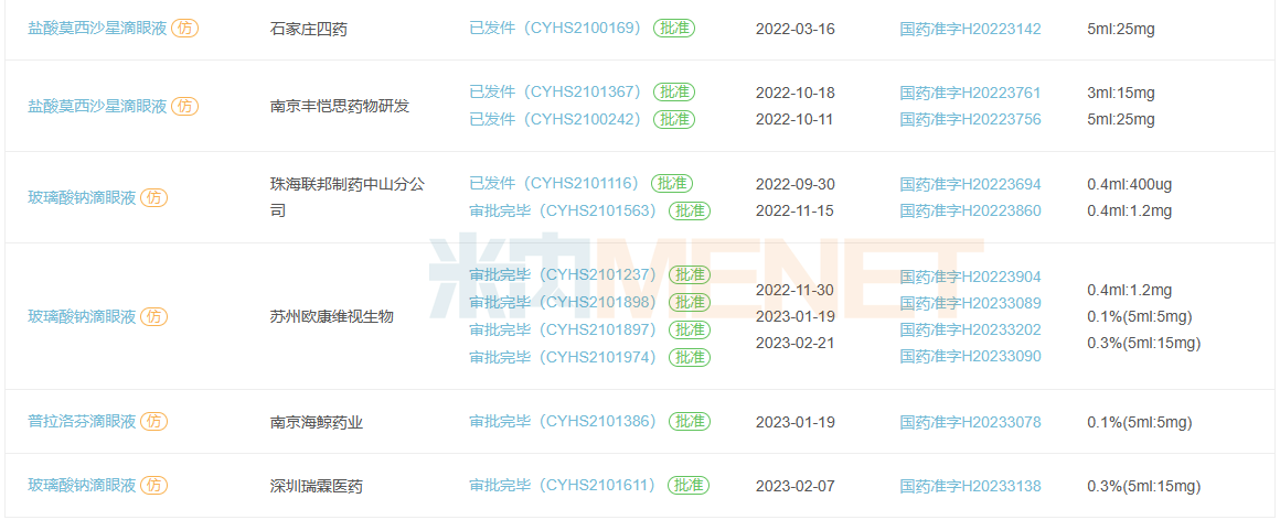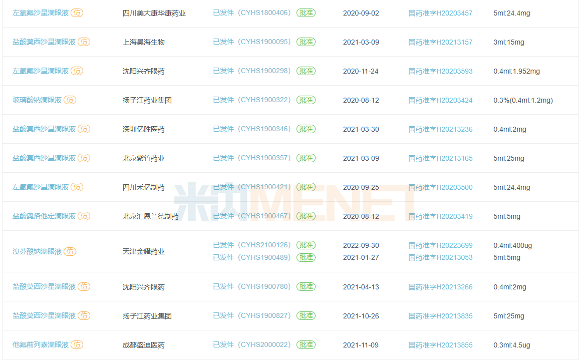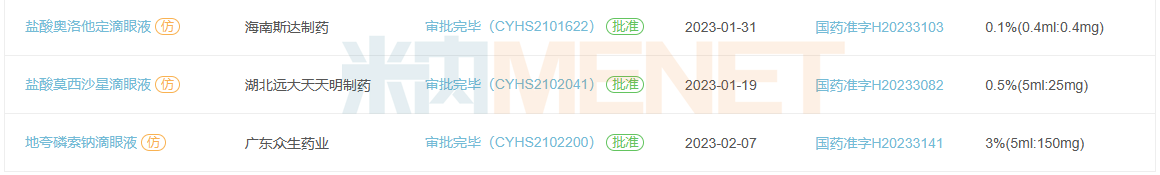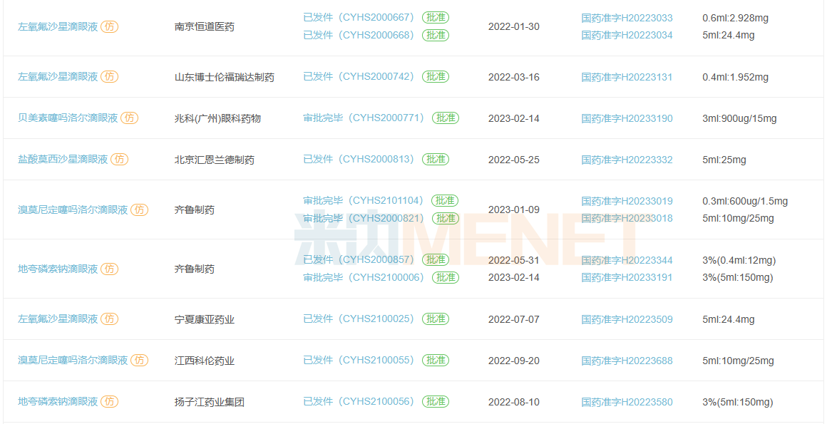 氯替泼诺混悬滴眼液、核黄素磷酸钠滴眼液、环孢素滴眼液(Ⅲ)、氟比洛芬钠滴眼液、二氟泼尼酯滴眼液、平衡盐眼内灌洗液、环孢素眼用乳剂等国内暂无仿制药获批,涉及江西科伦药业、湖北远大天天明制药、武汉先路医药成都普什制药等多家企业。