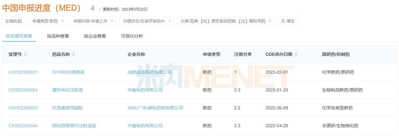 4个新药亮眼,分别是成都盛迪医药的SHR8058滴眼液、齐鲁制药的雷珠单抗注射液和阿柏西普眼内注射溶液、兆科(广州)眼科药物的环孢素眼用凝胶。