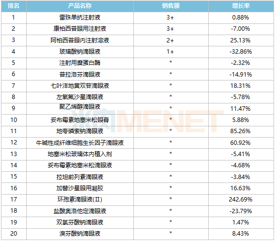 2022Q1-Q3重点省市公立医院终端眼科用药产品TOP20(单位:亿元)