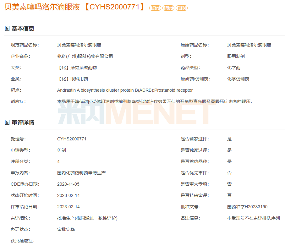 日前,兆科(广州)眼科药物研发的抗青光眼药物贝美素噻吗洛尔滴眼液以仿制4类报产获批上市,拿下首仿,是公司第一款获批的仿制药物。该产品用于降低对β-受体阻滞剂或前列腺素类似物治疗效果不佳的原发性开角型青光眼及高眼压症患者的眼压。米内网数据显示,贝美素噻吗洛尔滴眼液在2022年前三季度重点省市公立医院终端销售额同比增长近6%,仅有原研厂家美国艾尔建在销售。