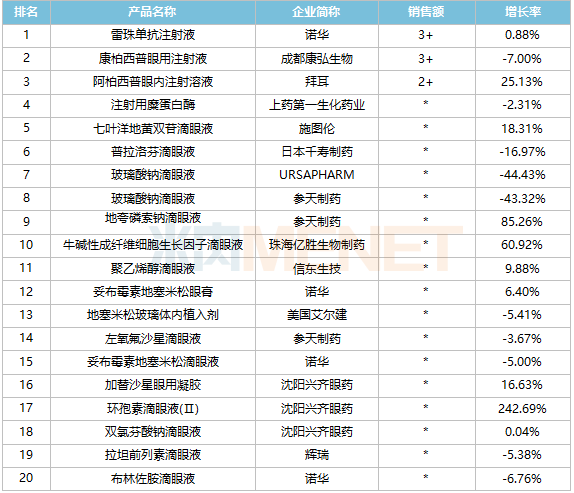 品牌TOP20仍是外资企业占据主导,前五位仅有成都康弘生物的康柏西普眼用注射液、上药第一生化药业的注射用糜蛋白酶2个国产品牌。从品牌数量来看,诺华最多有4个,参天制药和沈阳兴齐眼药各有3个上榜。