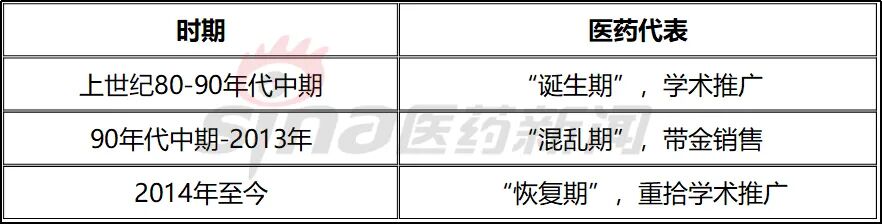 1995-2014年,群雄割据混乱期。到九十年代中期,合资企业赚得盆满钵满,这令国内制药企业看得眼睛发红。一批国内制药企业试图效仿外企的医药代表推广模式,然而,事情并没有想象的容易。一方面,国内制药企业生产的药品并未经过严格的临床验证,自然不会有过多指导医生用药的经验;另一方面,国企人才的准入和培训机制极其不完善,企业不愿意也没能力投入大量的资金构建自身的人才队伍。因此,国内制药企业普遍认为,学术推广的模式并不适用。