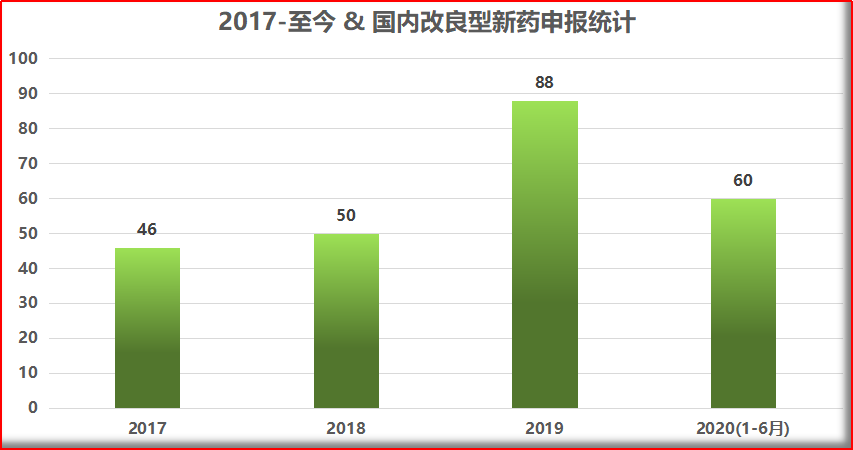 通过药智数据查询,2017年CDE承办的2类新药受理号共46条,2018年为50条,2019年为88条;2020年上半年达到60条,且以当前申报数量看,本年度2类改良型新药申报数量将稳步超过去年,整体呈增长状态。