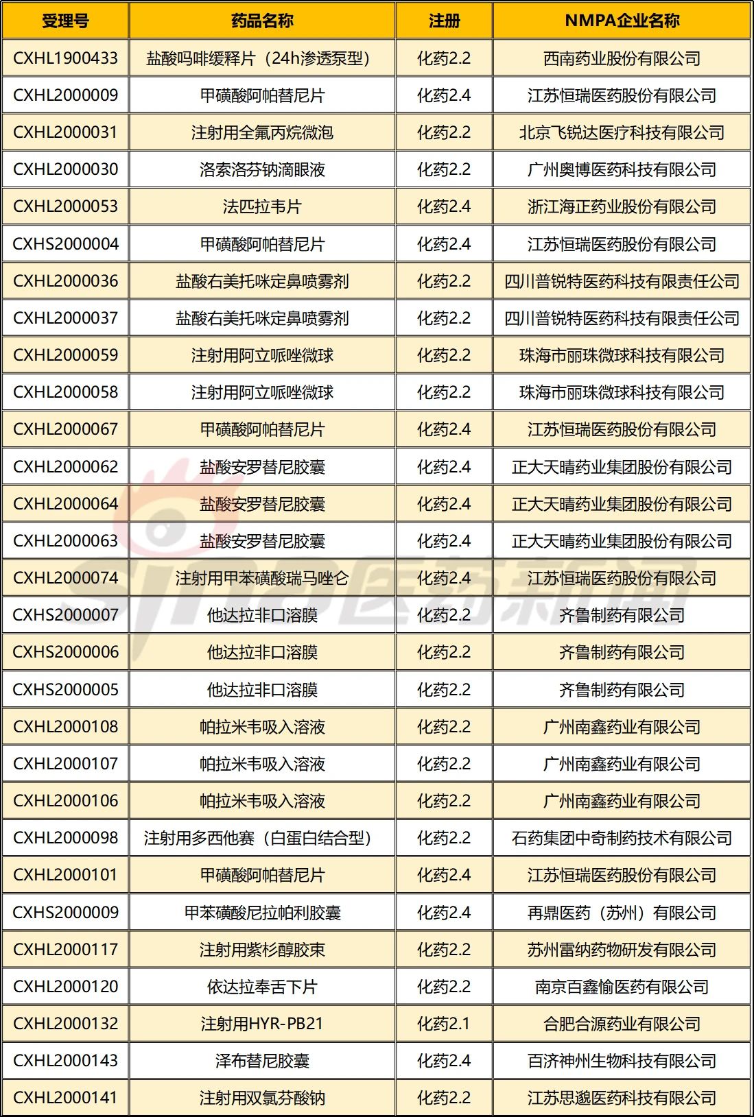 初步统计,2020年上半年国内以2.2化药分类注册申报的受理号共计28条,涉及活性成分20个。其中,国内1类新药丁苯酞,由南京优科制药有限公司&南京力博维制药有限公司联合注册申报丁苯酞注射液;PDE-5抑制剂他达拉非,齐鲁制药以口溶膜的剂型进行开发并申报;而南京绿叶开发的盐酸伊立替康氟脲苷脂质体注射液,以化药2.2/2.3注册申报;江苏奥赛康药业开发的注射用格列本脲以2.2/2.4注册申报。