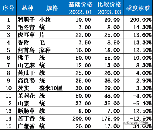 从季度涨跌看:上涨品种占比高,且异动特征明显。在监测的44个品种,上涨品种有鸦胆子、毛冬青、虎耳草、香附、何首乌、佛手、山芝麻、苦瓜干、高良姜合计9个,占比20.45%;其中鸦胆子因短期需求快速增量,导致行情上涨幅度高达200%。下滑品种有芡实、茉莉花、山柰、断肠草、苦丁香、广藿香合计6个,占比13.34%;其中广藿香因防疫需求原料疲软,且社会生产激增,行情迎来回落,降幅达到34.60%。