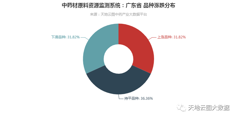 从涨跌分布看:在1年时间里,广东省中药材行情涨跌分布处于相对平衡状态。其中上涨品种有14个,占比31.82%;下滑品种有14个,占比31.82%;持平品种有16个,占比36.36%。