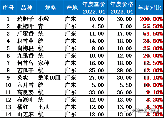 表2:2022.04-2023.04,监测的44个广东省中药材原料年度上涨品种