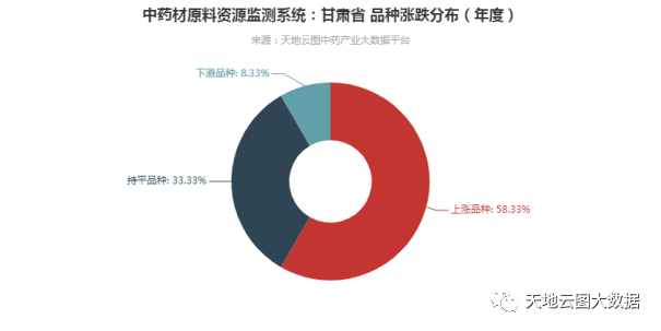 从年度分布看:在1年时间里,甘肃省中药材行情涨跌分布处于明显平衡状态,上涨品种占比接近60.00%。其中上涨品种有21个,占比58.33%;下滑品种有3个,占比8.33%;持平品种有12个,占比33.33%。