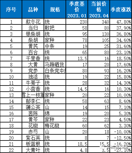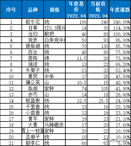 表2:2022.04-2023.04,监测的36个甘肃省中药材原料年度上涨品种