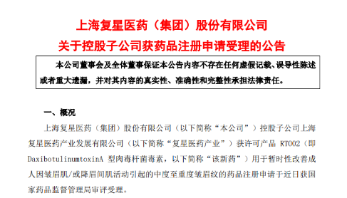 近日,上海复星医药(集团)股份有限公司(简称:复星医药)宣布,控股子公司上海复星医药产业发展有限公司(简称:复星医药产业)许可引进的RT002(即Daxibotulinumtoxin A型肉毒杆菌毒素)用于暂时性改善成人因皱眉肌/或降眉间肌活动引起的中度至重度皱眉纹的药品注册申请于近日获国家药品监督管理局审评受理。这也意味着,复星医药半只脚踏进了肉毒素赛道。