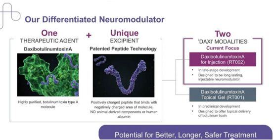 RT002的美容适应症即消费者熟知的肉毒素项目。据了解,该产品是基于Revance专有的TransMTs技术平台开发出的含有稳定肽制剂和高度纯化的A型肉毒杆菌毒素的新一代神经调节剂,除皱效果的中位持续时间为6个月。