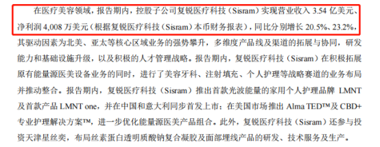 复星医药在医美领域布局已久,尤其是控股子公司复锐医疗科技已成为医美领域龙头企业。复星医药2022年财报显示,复锐医疗科技实现营业收入3.54亿美元、净利润4008万美元,同比分别增长20.5%、23.2%。