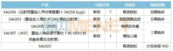 资料显示,SAL056为每周注射一次的特立帕肽冻干制剂,用于治疗骨折高风险的绝经后妇女骨质疏松症,目前国内尚无同规格及用法用量的产品上市。若SAL056研发成功并获批上市,将与公司已上市销售的特立帕肽注射液(每天注射一次的液体制剂)、注射用重组特立帕肽(每天注射一次的粉针剂)形成互补,进一步丰富公司骨质疏松领域的产品管线,公司预计该产品将于2024年申报上市。