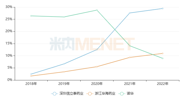 米内网数据显示,在重点省市公立医院终端高血压用药市场,信立泰在2018年成为作用于肾素-血管紧张素系统药物TOP9企业,2021年升至TOP1,2022年继续蝉联冠军,市场份额则从2018年2.46%升至2022年的29.43%,领军优势十分明显,2022年该小类市场的TOP2企业为华海药业,市场份额在10.95%。