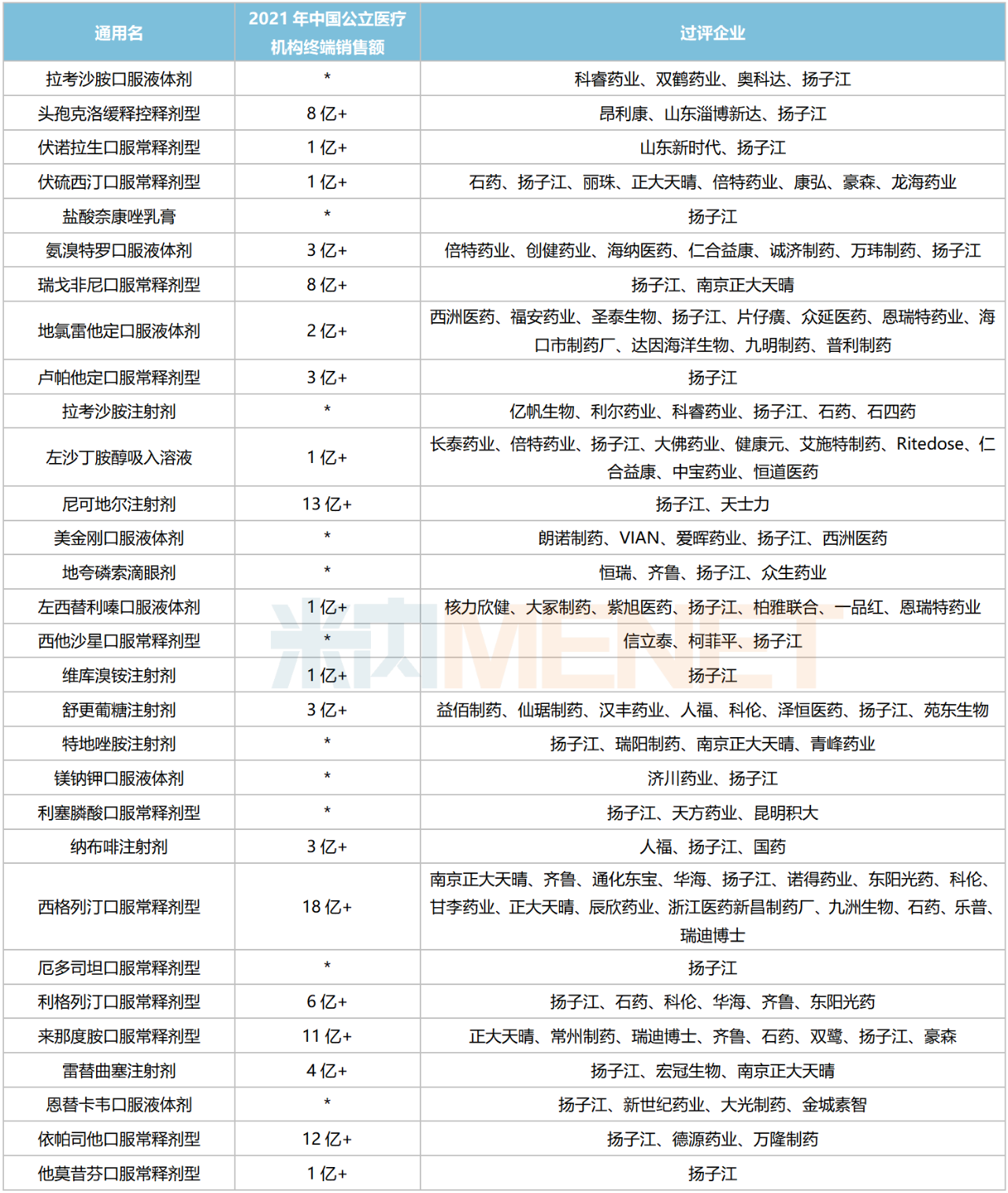 拉考沙胺口服液体剂、伏硫西汀口服常释剂型、氨溴特罗口服液体剂、地氯雷他定口服液体剂、拉考沙胺注射剂、左沙丁胺醇吸入溶液、美金刚口服液体剂、特地唑胺注射剂、地夸磷索滴眼剂、左西替利嗪口服液体剂、舒更葡糖注射剂、西格列汀口服常释剂型、利格列汀口服常释剂型、来那度胺口服常释剂型14个品种符合申报资格企业数均达5家及以上,其中,西格列汀口服常释剂型、来那度胺口服常释剂型2021年在中国公立医疗机构终端销售额均超过10亿元。