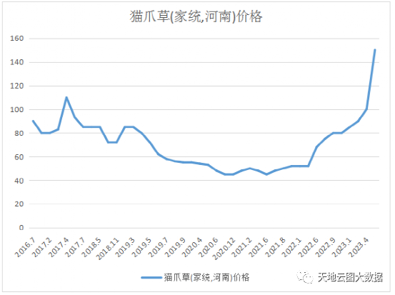 2022年产新后传出减产,加上有部分农户减少了种植面积,关注商家增加,价格上涨到80元。2023年产地继续传出减产消息,猫爪草价格继续大幅走高,行情来到150元。