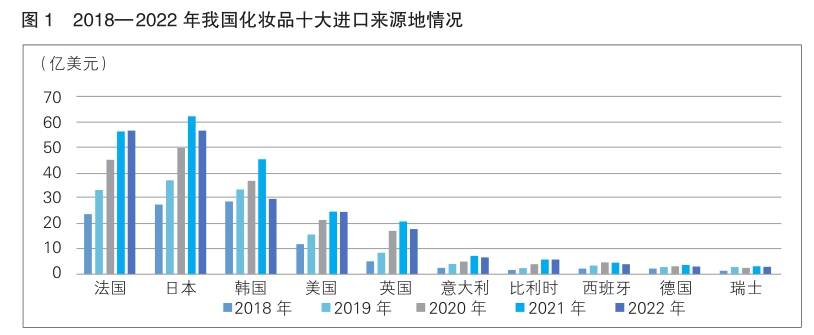 2022年, 我国化妆品进口较2021年总体呈下降态势, 主要化妆品进口来源地对我国化妆品出口大部分出现显著下滑。 我国是法国第三大化妆品出口市场, 仅次于美国和德国, 近5年来法国对我国化妆品的出口增长持续减缓, 尤其是与2021年相比, 2022年的增长率从24.21% 减少到0.96%, 但法国是我国化妆品前五大进口来源地中唯一保持出口正增长的国家。