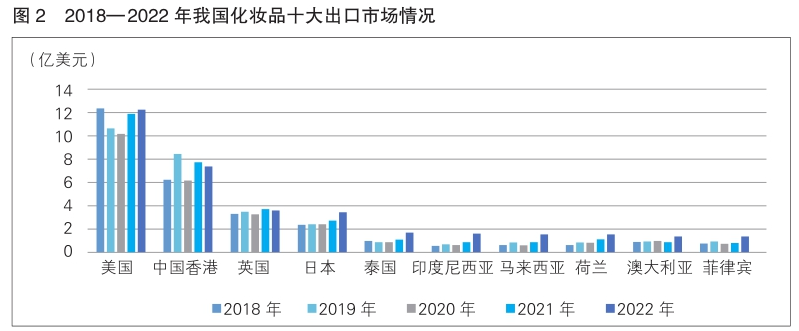 与进口不同,我国化妆品出口市场相对分散。2022年我国出口额排名前五位的市场分别是美国、中国香港、英国、日本和泰国,占我国化妆品出口总额的50%。美国是我国化妆品出口第一大市场,占我国化妆品出口总额的21.6%,2022年出口额12.4亿美元,同比增长3.6%。中国香港和英国分别是我国第二、三大出口市场,2022年出口额分别达7.42亿美元和3.63亿美元,较2021年都出现了负增长,分别减少3.5%和2.2%。日本和泰国分列第四和第五,2022年出口额分别为3.4亿美元和1.7亿美元,同比增长2.5%和5.4%。排名六到十位的国家或地区分别是印度尼西亚、马来西亚、荷兰、澳大利亚和菲律宾,仅占我国出口总额的13.3%(详见图2)。