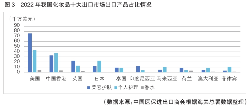 与进口相似,我国2022年出口额最大的产品类别是美容护肤品,总额为28.3亿美元,同比增长13%,前五大出口市场为美国、中国香港、英国、印度尼西亚和日本。其次是个人护理类产品,出口额达26.4亿美元,同比增长21.7%,前五大出口市场为美国、中国香港、日本、英国和马来西亚。香水出口额最少,为2.5亿美元,但同比增长最为迅猛,达38.6%,排名前五的出口市场分别为美国、中国香港、荷兰、英国和阿联酋。其中,英国和美国市场表现尤为抢眼,同比增长分别达到71%和65%,荷兰紧随其后,达到44%(详见图3)。
